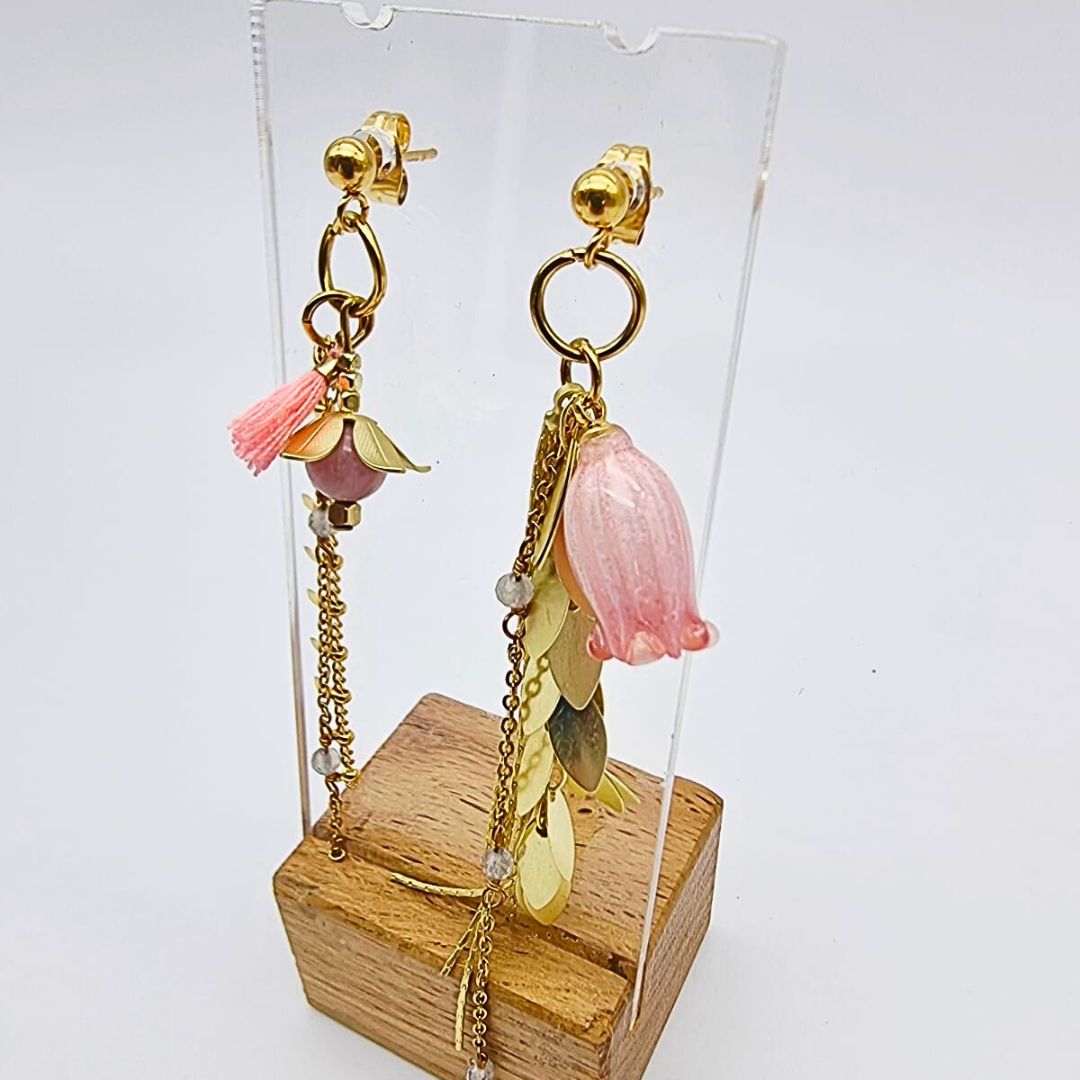 Boucles d’oreilles asymétriques “Campanule” – fleurs résinées, perles, pompons et pampilles dorées.
