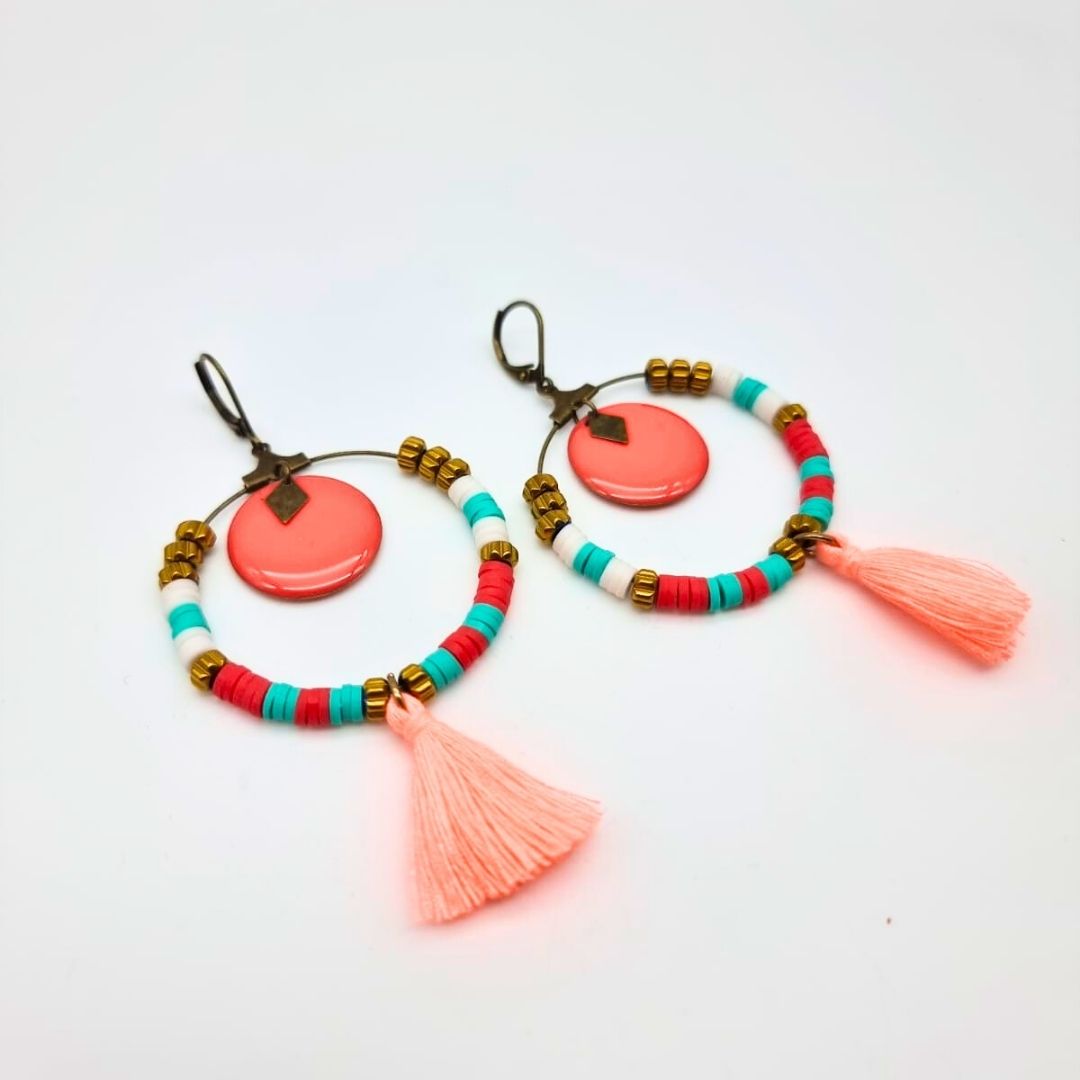 Matières : Laiton bronze, sequin en résine émaillée corail, perles Heishi, pompon textile