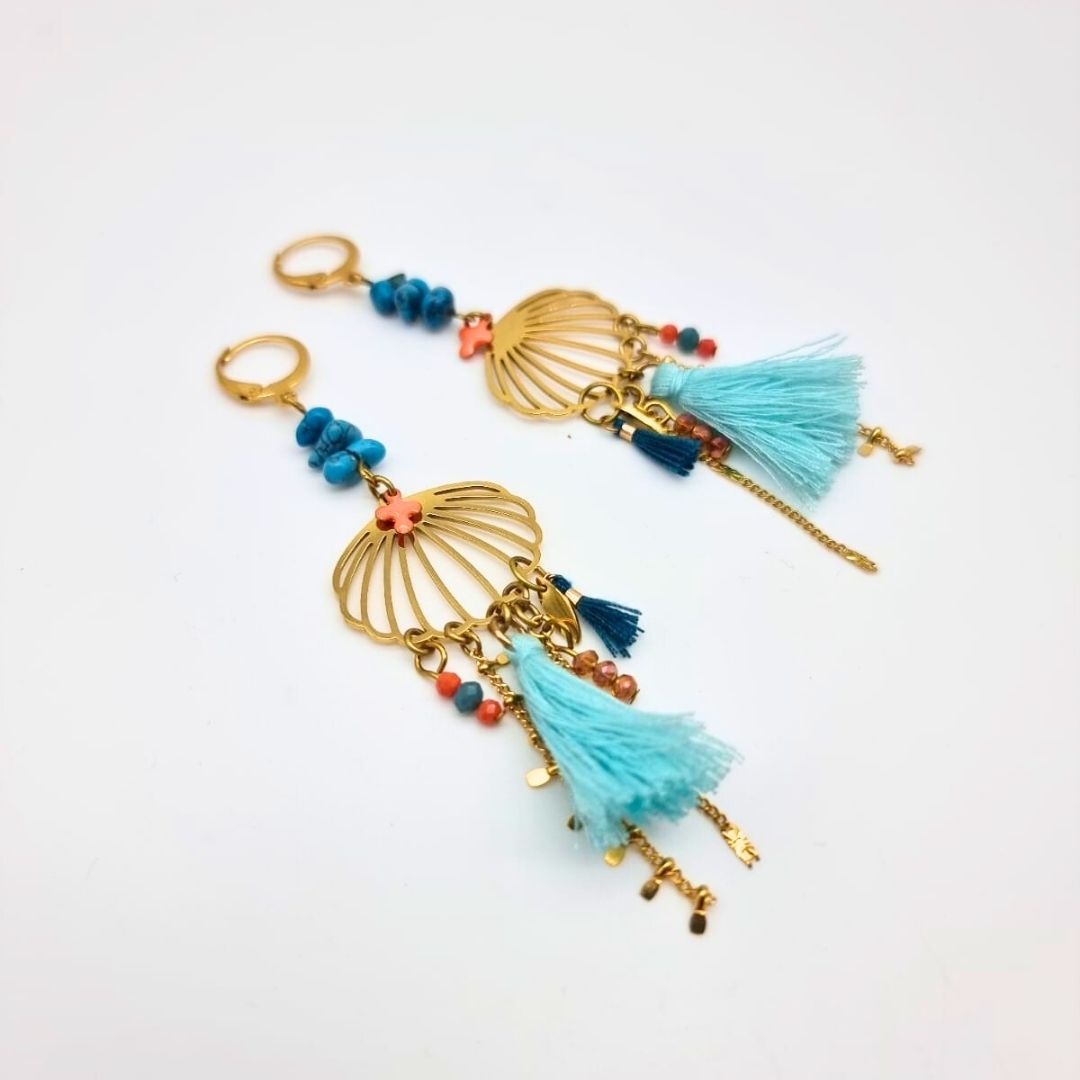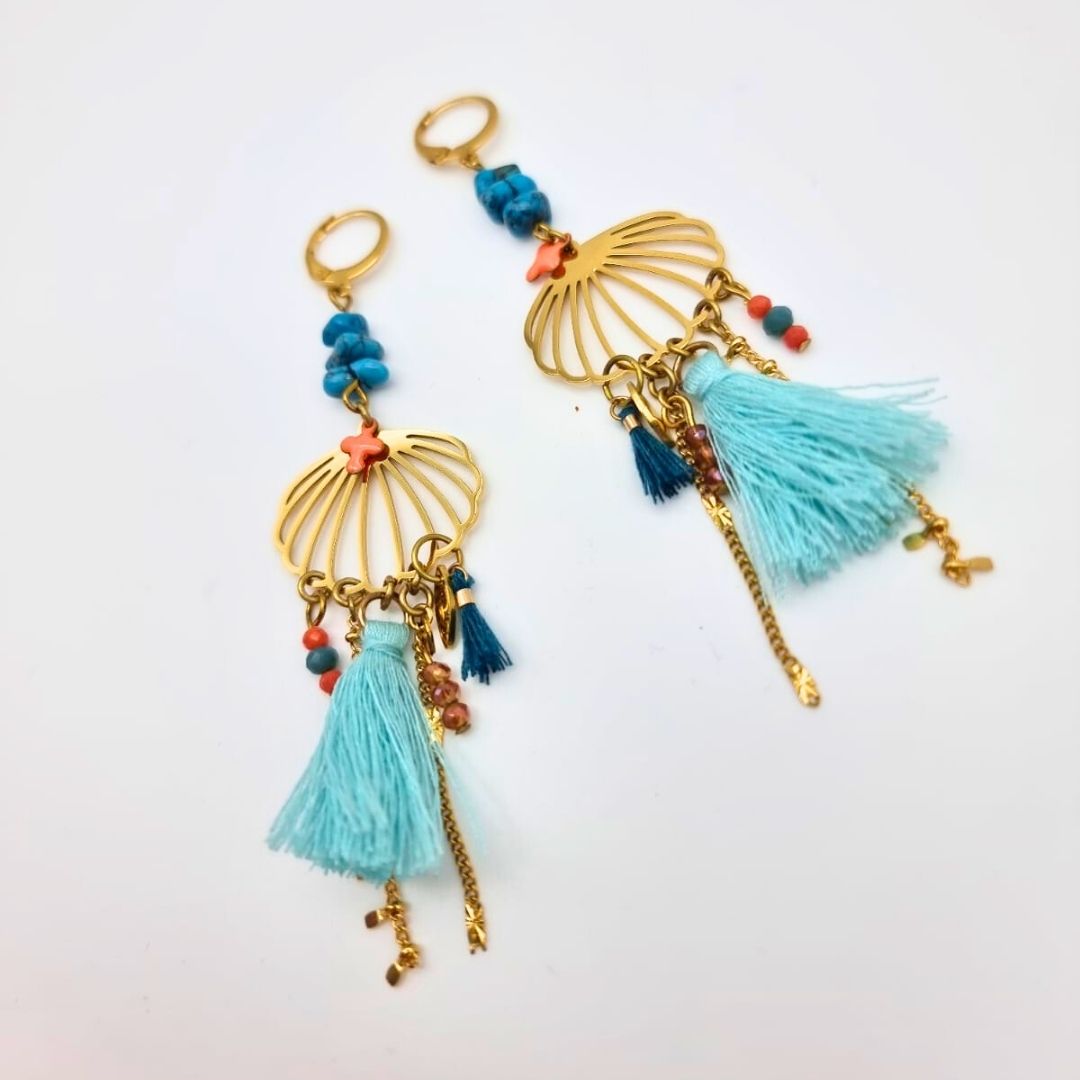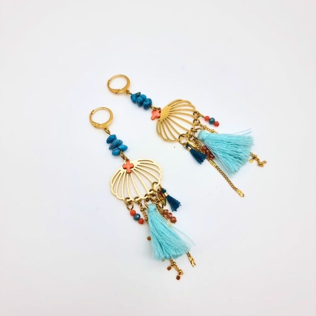 Leur motif coquillage doré est sublimé par des pierres semi-précieuses turquoise, des perles de verre et un pompon textile qui apporte mouvement et légèreté.