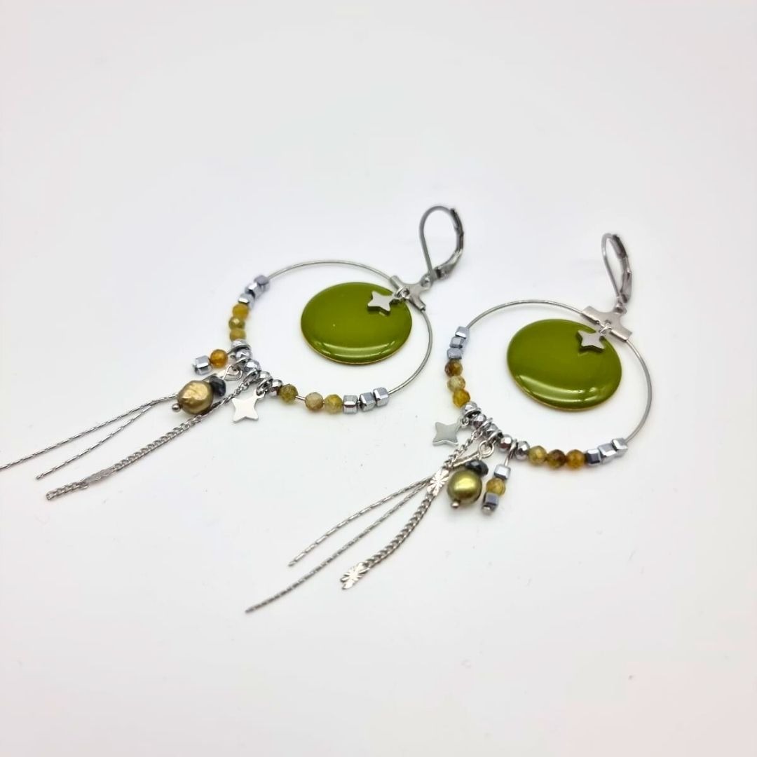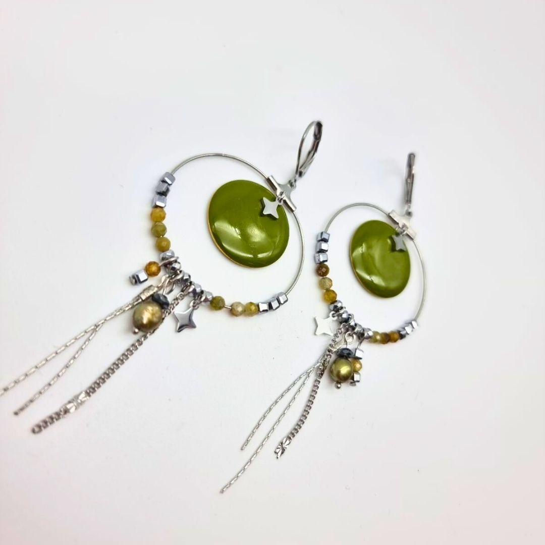 Ces boucles d’oreilles créoles acier et kaki incarnent parfaitement l’esprit signature de Charly&Kty : un bijou bohème chic, intemporel et lumineux.