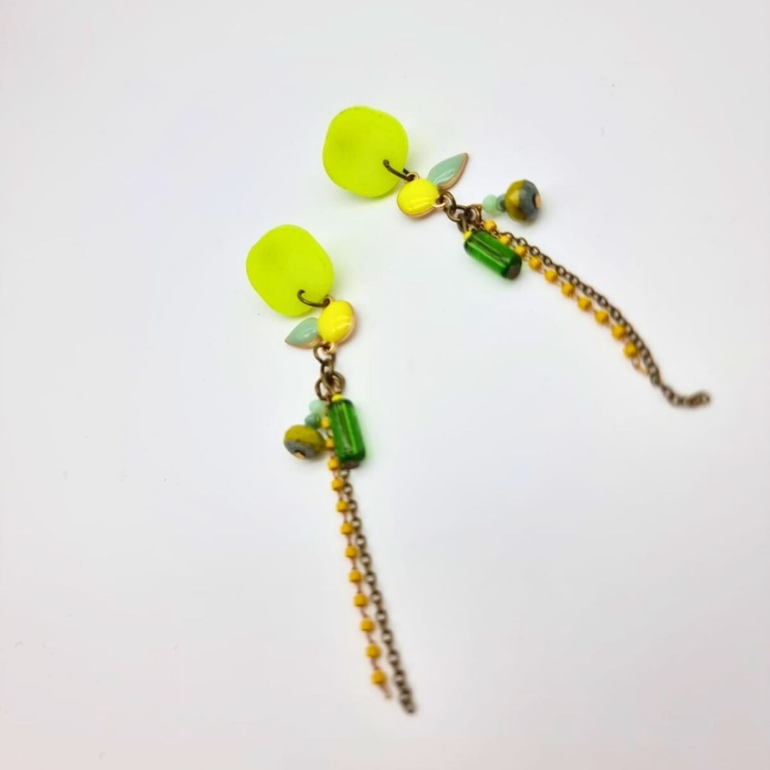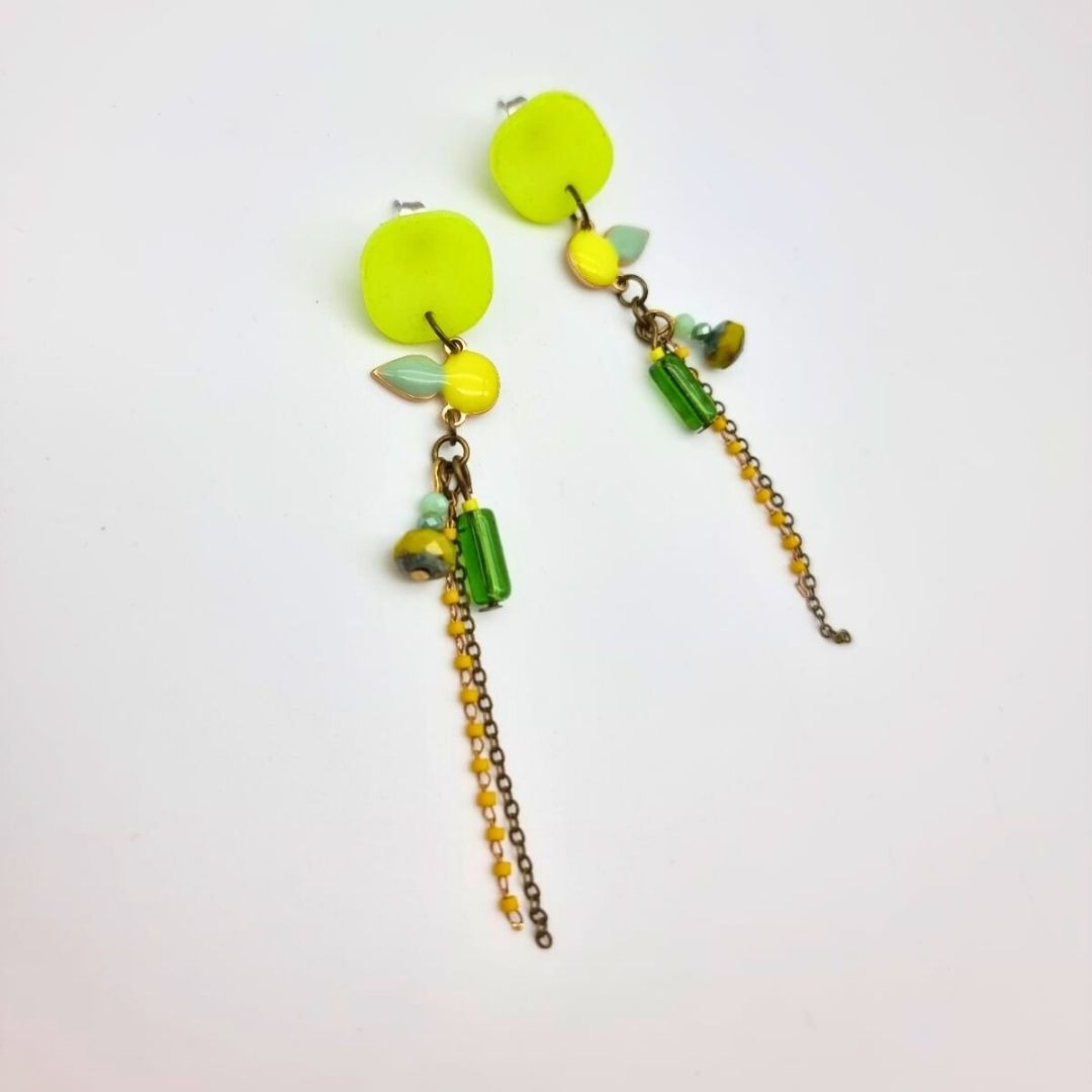 Ces boucles d’oreilles pendantes et colorées sont une création artisanale réalisée à la main dans les Monts du Lyonnais.