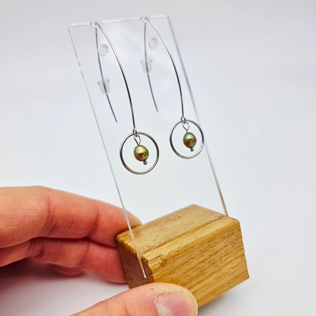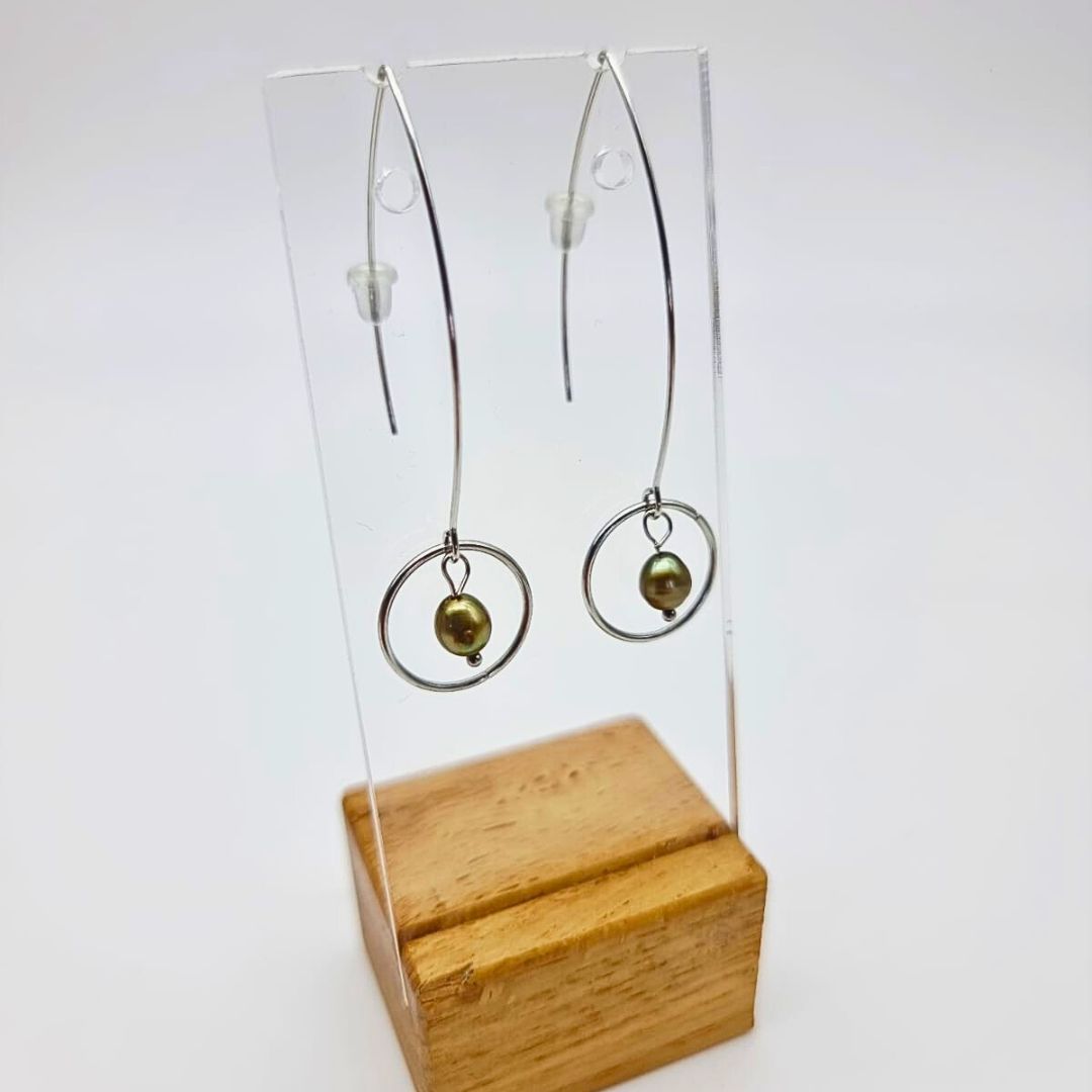 Boucles “Perle Suspendue” – acier inox & perle de culture verte