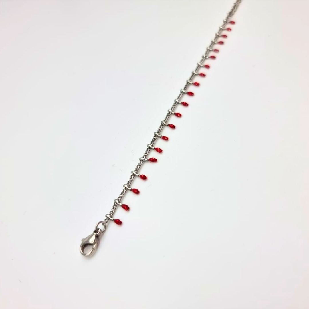 Ce bracelet élastiqué en perles de corail rouge séduit par sa couleur intense et chaleureuse, inspirée de l’univers marin et de l’été. Les perles cylindriques apportent un style graphique et affirmé, tandis que la breloque centrale en laiton plaqué argent ajoute une touche de caractère et d’élégance.
