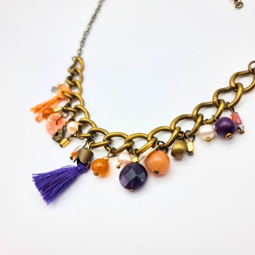 Collier chaîne bronze à pampilles – perles de verre, pompons en coton et breloques colorées