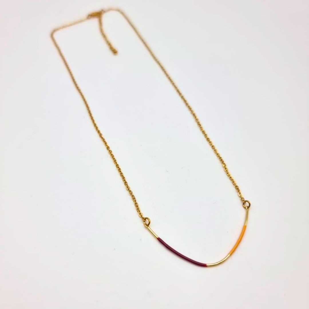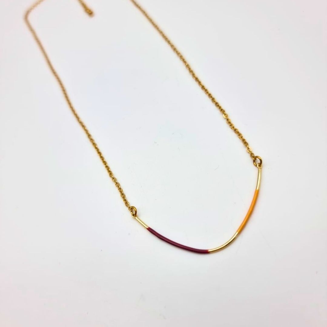 Un ras-de-cou fin et élégant mêlant acier inoxydable doré et résine colorée bordeaux et moutarde. Un bijou minimaliste et lumineux, parfait pour sublimer le cou au quotidien.